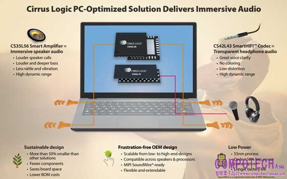 思睿邏輯Cirrus Logic(Nasdaq: CRUS)本(1)日宣布推出專為個人電腦打造的頂級音訊方案,無論使用輕薄筆電微型內建喇叭或者外接耳機、進行語音通話或聆聽音樂,都能享有更響亮與沉浸式的聽覺體驗。Cirrus Logic 針對個人電腦加強的音訊解決方案包含:內建運算能力、帶動更優異音質的 Cirrus Logic CS35L56 智慧音訊功率放大器,還有結合 MIPI SoundWire 介面(v1.2)的低功率 CS42L43 SmartHIFI™ PC 音訊編解碼器(codec),以先進的技術,協助個人電腦製造商簡化設計,在減少總元件數量、節省主機板空間之餘,更有助於降低物料成本。