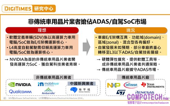 2023年6月7日--NVIDIA、Mobileye、高通(Qualcomm)、Ambarella、地平線等非傳統車用晶片業者搶佔先進駕駛輔助系統(Advanced Driver Assistance System;ADAS)/自駕SoC(系統級晶片;System on Chip)市場,當車廠調整電子電氣架構(Electrical/Electronic Architecture;E/E架構)與ADAS/自駕等開發路線,非傳統車用晶片業者亦修正產品策略,DIGITIMES研究中心分析師陳一帆歸納業者共通策略包含拓展SoC產品線供車廠彈性組合、開放軟體開發工具(Software Development Kit;SDK)助車廠客製編寫等。車廠方面,中國車廠對非傳統車用晶片業者ADAS/自駕SoC的採納速度快於國際傳統車廠,部分車廠則傾向與多家晶片業者合作。