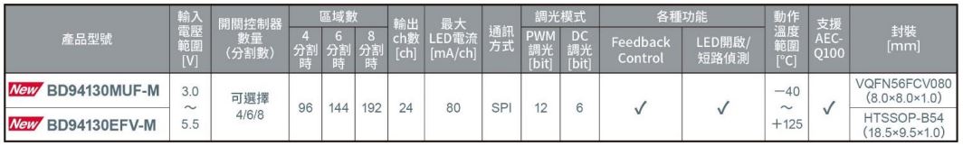 「BD94130xxx-M」是一款矩陣式LED驅動器,由最多可進行8分割的開關控制器和24通道電流驅動器組成。開關控制器的數量可以透過寄存器設定,從三種模式(4、6、8分割)中做選擇,因此可以根據區域數和LED的消耗電流來適應各種規格的應用。另外該產品還內建回饋控制功能,無論LED的溫度特性如何,都能使回饋電壓保持恒定,有助減少熱設計工時並降低能源耗損率。