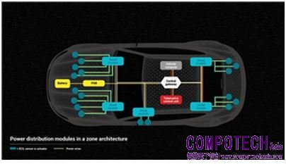 在區域架構中,配電箱是分散的,以便每個區域都有自己的配電單元來為相應區域中的模組供電。圖 2 顯示區域架構中的配電概念,您可以在其中看到每個區域都整合配電功能和管理網路流量的區域模組。新的配電架構將減輕線束電纜的重量,進而提高內燃機車輛的燃油效率,提高電池電動車的行駛里程。