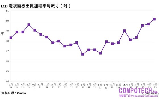 京東方(BOE)、華星光電(China Star)、咸陽彩虹光電(CHOT)、LG Display 和夏普(Sharp)等面板製造商的 LCD 電視面板出貨加權平均尺寸在 2022 年 8 月為 46.8 吋,於 2022 年 12 月回升至 49 吋,2023 年 3 月達到 49.5 吋,並且在 2023 年 5 月首次突破 50 吋來到 50.2 吋。