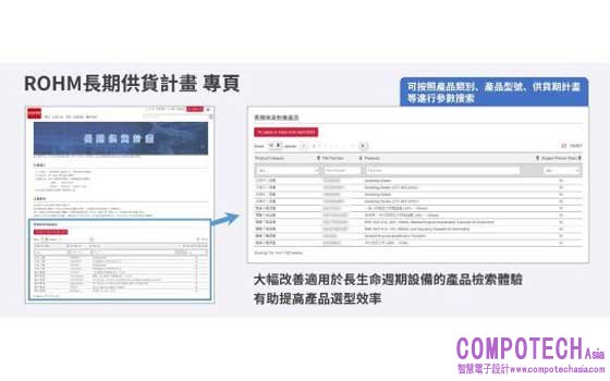 本次ROHM將根據生產體系、設備、材料採購情況等,將篩選出的產品正式納入「長期供貨計畫」的管理中,並透過開設專頁,公佈供貨期計畫,大幅改善產品檢索體驗,有助提高客戶產品選型效率。