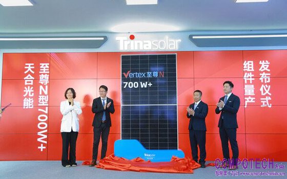 2023年8月31日--8月18日,天合光能至尊N型700W+組件量產暨2024年組件升級發布會在青海一體化基地隆重舉行。基於新一代N型i-TOPCon先進技術疊加210產品技術的加速全面應用,至尊N型700W+組件提前實現量產。天合光能也成為行業率先實現TOPCon組件量產功率突破700W的組件制造商。當天,天合光能還重磅預發布2024年升級產品,大版型組件功率達710W,中版型組件達620W。現場,天合光能攜手行業伙伴發布《共同推進行業持續健康發展穩步邁入700W+》倡議書,210+N一體化產業布局,全面引領多場景客戶價值,推動行業開啟700W+時代。