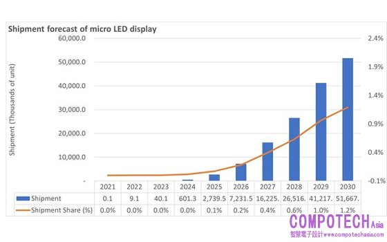 Micro LED顯示面板市場預計將從2025年開始真正成長,主要是由於對擴展現實( XR )設備和智慧手錶等通常用於戶外的小型顯示設備的需求。 到2030年,在Micro LED的總出貨量中,應用於XR設備中的Micro LED顯示面板份額預計將達到53.5% ,而應用於智慧手錶的份額將達到41.6% 。