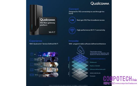 高通10G光纖閘道器平台專為支援10Gbps網路傳輸至家庭及家用所建構,其軟體定義架構結合了10G被動光纖網路(PON)技術與數千兆位元Wi-Fi 7 連接能力,可確保從家用網路到手機、PC、智慧電視、家用攝影機或電器等終端裝置享有無縫的高速連接能力和低延遲存取。