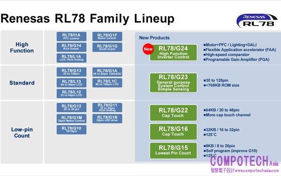 Toshihiko Seki, Vice President of MCU Device Solution Division at Renesas表示:「我們很高興在廣受歡迎的RL78系列中推出更高等級產品,該系列在目前全球16位元MCU市場上的市占率最高。憑藉廣泛的功能和規格,RL78系列使我們的客戶能夠實現高性能,同時最大限度地降低成本。」