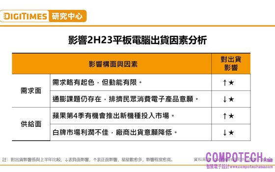 DIGITIMES分析師蕭聖倫觀察品牌平板佔比變化,2023年第2季蘋果平板出貨季減幅度高於非蘋平板,使蘋果平板電腦佔全球品牌電腦出貨量比重連續第2季下降。但因蘋果第3季預期開始回補庫存,第4季則有小尺寸新品上巿,將帶動下半年佔比逐季回升。
