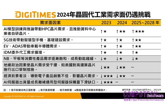 DIGITIMES分析師陳澤嘉表示,2023年半導體景氣不佳使全球晶圓代工產業營收下滑至1,215億美元,減少13.8%,展望2024年,雖營收可望反彈,然總經成長動能不強及地緣政治風險是抑制產業成長動能的二大主因。晶圓代工業雖在短期面臨逆風,但HPC應用相關晶片需求仍強,5G、電動車(EV)等晶片用量提升也為晶圓代工業提供支撐,加上晶片自研風潮,以及IDM委外下單趨勢不變,而新產能也持續開出以因應產業需要,中長期晶圓代工營收成長仍可期。