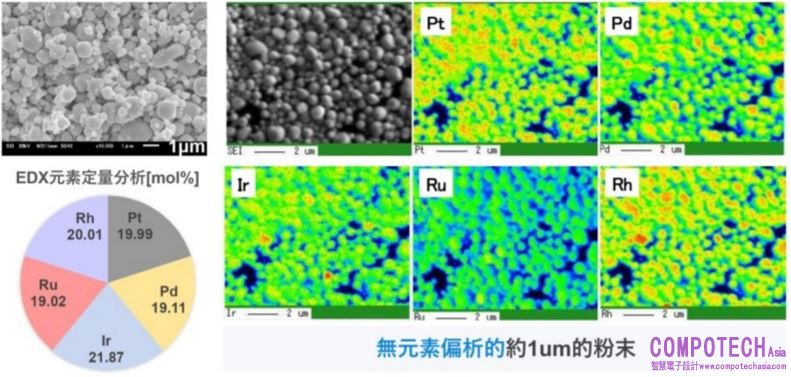 2023年10月25日--經營產業用貴金屬事業的田中貴金屬集團核心企業—田中貴金屬工業株式會社(總公司:東京都千代田區、執行總裁:田中浩一朗)宣佈成功開發出由貴金屬組成的高熵合金粉末,其擁有10µm以下的細微粒徑,並同時具有高結晶性,在組成的均勻性方面表現優異。本產品是僅由鉑(Pt)、鈀(Pd)、銥(Ir)、釕(Ru)、銠(Rh)等5種貴金屬組成的世界首創高熵合金粉末。本產品已確立量產製程,並預定從10月份開始提供樣品。