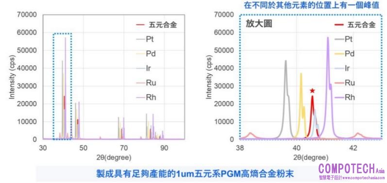 (※1)關於高熵合金粉末已於2023年6月29日取得專利(專利第7300565號)。本產品中的貴金屬合金粉末定義為:①由5種以上貴金屬元素之合金組成的貴金屬合金粉末;②平均粒徑為10µm以下;③晶粒尺寸為60nm以上;④X射線衍射光譜中衍射角度2θ在38-44°的範圍內觀察到的峰值為1個。