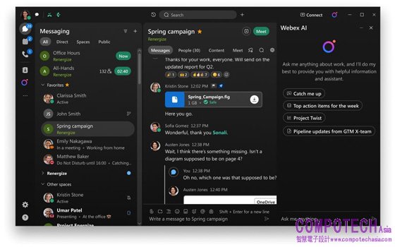 • 訊息摘要透過重點回顧未讀訊息或對話,助用戶了解最新資訊。舉例來說,客製化功能讓用戶能使用Webex人工智慧助理,從多人的對話中總結上司的訊息。
