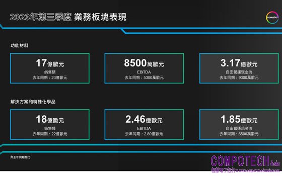 2023年第三季度功能材料板塊的銷售額較去年同期下滑26.7%至17億歐元(去年同期:23億歐元),主要原因為平均銷售價格的大幅下降。該板塊的EBITDA較去年同期增長60.4%至8500萬歐元(去年同期:5300萬歐元),主要原因是利潤率提升和固定成本降低。自由營運現金流增長至3.17億歐元(去年同期:9300萬歐元)。