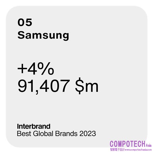 2023年11月22日--三星電子連續四年榮登全球品牌顧問公司Interbrand公佈的「全球最佳品牌」前五名。Interbrand每年定期公佈「全球最佳品牌」排名,今年榜單顯示,三星的品牌價值高達914億美元,較去年成長4%。