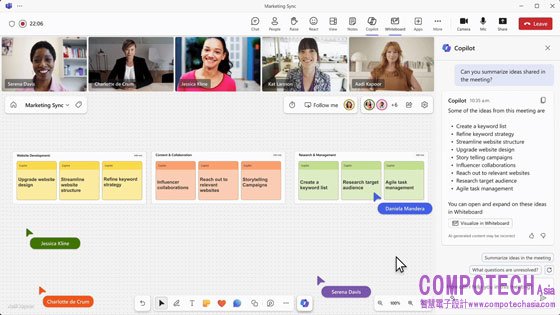 • AI 深入生產力工具,全面激發創造力:在 Microsoft 365 應用程式中 Word、Excel、PowerPoint、Outlook、Teams 等生產力工具,使用者可以使用自然語言,要求 Copilot 生成、歸納想法、總結內容並產出設計;此外,我們也持續為 Copilot 新增功能,如白板中的 Copilot,可幫助你在 Microsoft Teams 會議以及進行腦力激盪時更加創意高效,透過全新的白板與筆記功能,能夠自動擷取並視覺化線上會議的對話摘要,並讓與會者共同編輯;用戶也能夠藉由 Microsoft Loop 建立團隊與 Copilot 共同協作的空間,提供員工更智慧的商務功能,達到創造力與生產力的雙面加乘。