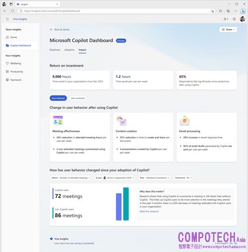 • 打造嶄新 IT 管理模式,便於企業導入追蹤:Microsoft 365 管理中心整合 Viva 中的數據提供 Copilot for Microsoft 365 使用報告,協助企業輕鬆規劃與追蹤員工使用情形。透過儀表板數據分析,亦能依據員工使用 Microsoft 365 應用程式之情況,提供管理者評估、追蹤、計算使用成效,提升用戶使用效能。