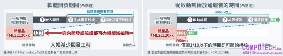 新產品是由硬體所構成,與由微控制器所構成的產品相比,無需進行軟體驗證,可以大幅縮短開發週期。並且,可以用簡單的命令進行控制,與由微控制器生成聲音的一般方式相比,只需不到1/10的時間即可發出警示音。此外,還配備故障偵測功能,可偵測出與主要微控制器之間的通訊異常,以及由外接元件所引起的異常振盪,有助提高應用可靠性。