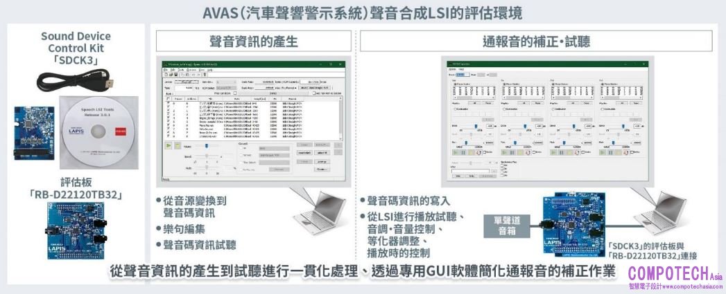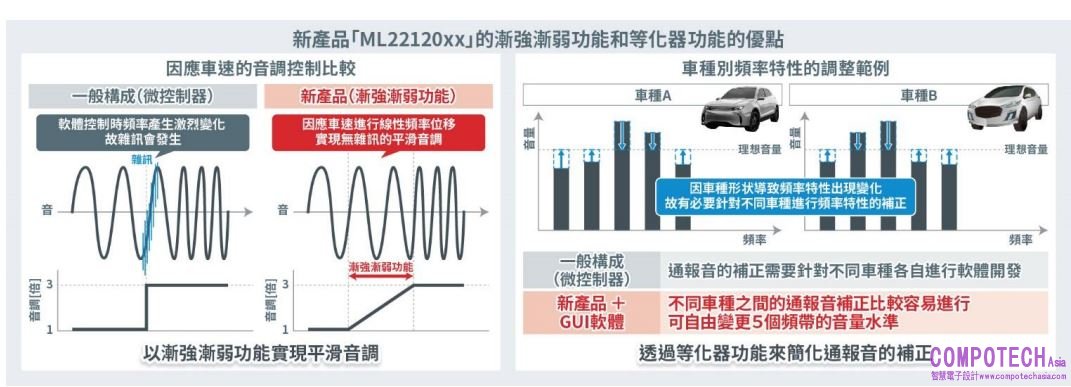 在使用微控制器生成警示音的情況下,需要能夠控制聲音的音高和音量以實現平滑漸變的效果,並根據車輛形狀調整頻率特性。也因此大幅增加了微控制器軟體開發的負擔,而且還需要驗證微控制器與其他軟體處理之間的運行情況。針對上述問題,LAPIS Technology利用其在語音合成LSI領域累積的豐富經驗和技術優勢,透過硬體設定實現了高音質,並推出了有助減輕AVAS(汽車聲響警示系統)開發負擔的新產品。