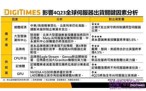 2023年11月27日--DIGITIMES研究中心統計2023年第3季全球伺服器出貨表現,分析師蕭聖倫指出如先前預期季增1.5%,主要由品牌商新平台機種上巿所帶動,美系大型雲端業者因出貨重心集中於AI伺服器,使整體伺服器採購量仍呈小幅衰退。蕭聖倫預期第4季全球伺服器出貨季增3.8%,美系大型雲端業者通用型伺服器出貨回升,AI伺服器出貨也將放量。