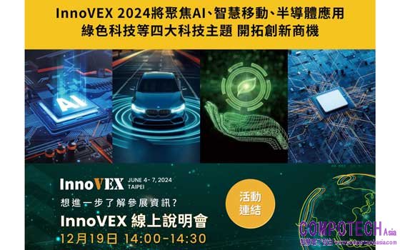 台北市電腦公會(TCA)表示,InnoVEX 2024將針對四大主題 - AI、Smart Mobility、Semiconductor Applications、Green Technology,推出特定相關活動,InnoVEX 2024全球線上招商說明會也將於12月19日起陸續登場。
