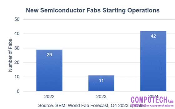 最新一季全球晶圓廠預測報告顯示,2022年至2024年預測期間,全球半導體產業計劃將有82座新設施投產,其中2023年及2024分別有11座及42座投產,涵蓋了4吋(100mm) 到12吋(300mm)晶圓的生產線。