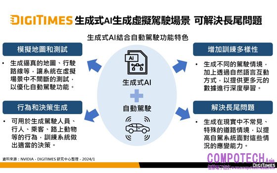2024年1月8日--2023年全球掀起生成式AI風潮,其應用與發展備受矚目。DIGITIMES 研究中心觀察,生成式AI可生成虛擬仿真交通場景及駕駛行為等數據資料,用於訓練自動駕駛系統在感知、預測、規畫、決策等功能,加上生成各式特殊情境,以解決辨識技術的長尾(long tail)問題,將為自動駕駛系統的發展帶來嶄新的機遇。NVIDIA、Tesla及Wayve等業者積極開發自動駕駛虛擬仿真場景生成技術,以搶佔市場先機。