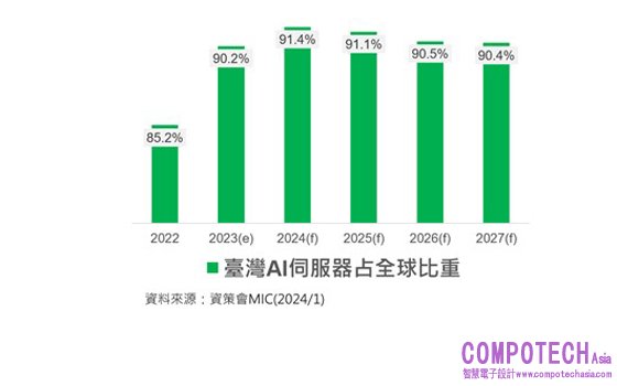 資策會產業情報研究所(MIC)表示,生成式AI熱潮持續帶動全球AI伺服器出貨成長,2023年AI伺服器產值已達全球伺服器過半的總產值,而臺灣伺服器產業出貨原本即占全球伺服器出貨八成以上,其中AI伺服器的生產組裝代工更已占全球九成,主要是臺灣產業具有高階伺服器的設計研發與代工能力,加上高階晶片進入大陸受到限制,以及美系客戶要求高階伺服器於非中地區生產等因素所驅動。產業顧問魏傳虔表示,生成式AI應用與AI伺服器出貨熱潮,皆有利於臺灣伺服器代工、電源供應器、遠端控制晶片、ABF載板、散熱模組等產業鏈業者的營收成長。