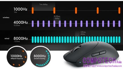 當輪詢率越高表示滑鼠將其位置告訴電腦的頻率越頻繁,代表反應更靈敏與精確度更高,游標在瞄準或在螢幕上移動時更順暢(類似於高刷新率顯示器的優勢)。當毫秒必爭時,ALIENWARE Pro無線滑鼠提供高於市面許多遊戲滑鼠的最大值1KHz的4KHz無線(0.25毫秒回應時間)和8KHz(0.125毫秒)有線輪詢率的優勢。