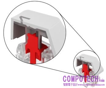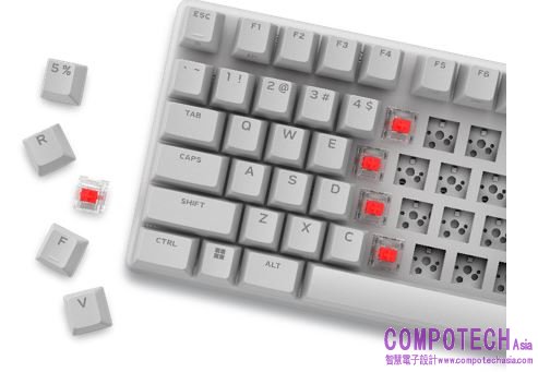 採用低摩擦POM(聚甲醛)材質,使用感流暢且不會有摩擦聲,兩層矽膠阻尼更消除回聲,產生令人愉悅的深沉音色。透明開關不僅聲音出色且外觀驚艷,為完全透明光導,將光線引導向上,讓每個按鍵都能均勻發光。