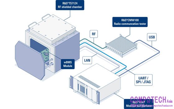 Rohde & Schwarz與ADI一起開發了一款超緊湊的無線電池管理系統(wBMS)自動化測試設備(ATE)系統。通過這個測試設置,可以快速、可靠地進行wBMS模組校準、接收機、發射機和直流測試,用於實驗室驗證以及高產量的生產測試。它包括R&S CMW100無線通訊測試儀、R&S WMT無線自動化測試軟體框架和新的R&SExpressTSVP通用測試和測量平台。由於是輻射測試,被測設備(DUT)被放置在無干擾環境中,如R&S TS7124 RF屏蔽箱。