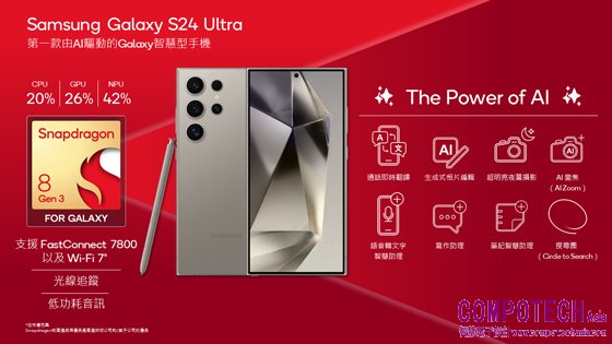 2024年1月17日--高通技術公司宣布推出專為Galaxy設計的Snapdragon 8 Gen 3(Snapdragon 8 Gen 3 for Galaxy)頂級行動平台驅動三星電子公司全球最新旗艦機種Galaxy S24 Ultra以及部分地區推出的Galaxy S24 Plus和S24。三星Galaxy S24系列導入Galaxy AI,充分運用全新增強業界頂尖的智慧和功耗效率領導者──Snapdragon 8 Gen 3 for Galaxy。