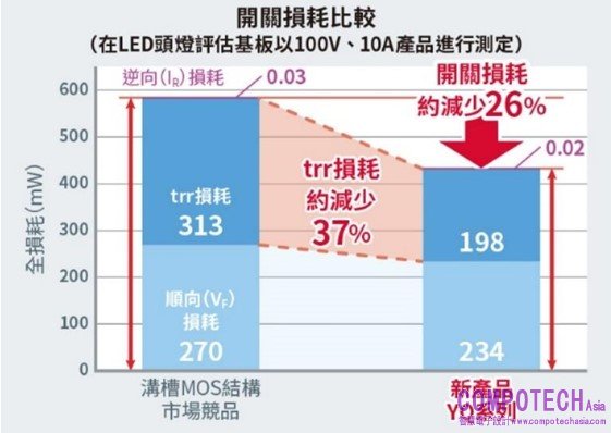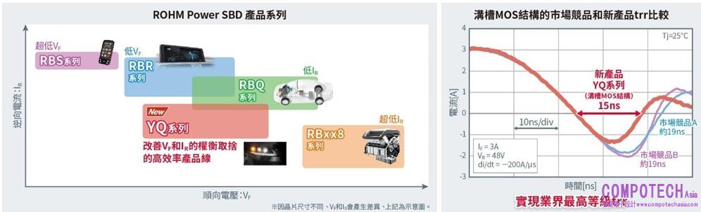 「YQ系列」是繼以往支援各種電路應用的4個SBD系列之後推出的新系列產品,也是ROHM首款採用溝槽MOS結構的二極體。該系列利用ROHM獨家結構設計,實現了業界最高等級trr(15ns),與同樣採用溝槽MOS結構的市場競品相比,trr單項的損耗降低約37%,總開關損耗降低約26%,因此有助降低應用產品功耗。另外透過採用溝槽MOS結構,與以往採用平面結構的SBD相比,順向施加時的損耗VF *2和逆向施加時的損耗IR*3均得到改善。這不僅可以降低在整流應用等順向使用時的功率損耗,還可以降低對於SBD而言最令人擔心的熱失控風險*4。這些優勢使該系列產品非常適用於容易發熱的車載LED頭燈的驅動電路、xEV用DC-DC轉換器等需要進行高速開關的應用。