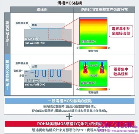 溝槽MOS結構是在磊晶片層中形成溝槽(溝槽MOS)並用多晶矽填充的結構,該種結構可以緩和電場集中,從而可以降低磊晶片層的電阻率,在順向施加時VF更低。另外當逆向施加時,可以緩和電場集中現象,從而實現更低的IR。前述的「YQ系列」透過採用此種溝槽MOS結構,與以往產品相比,VF改善了約7%,IR改善了約82%。另一方面,在普通溝槽MOS結構中,寄生電容(元件中的電阻分量)較大,因此trr會比平面結構的差。「YQ系列」不僅改善了VF和IR,而且還利用ROHM獨家結構設計,實現了約15ns的業界最高等級trr。由於可將開關時的損耗降低約26%,因此非常有助降低應用產品功耗。