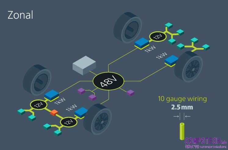 圖 2:48V 區域架構(zonal architecture)在整個車輛中使用較細的 10 號線,可將纜線重量銳減 85%。此外,分散 48V 至 12V 的轉換點,還可在端點使用電源模組實現高效對流散熱。