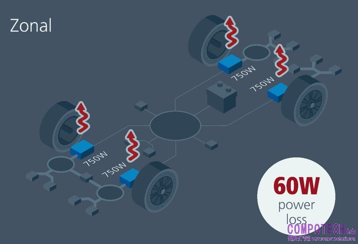 圖 3:標準 DC-DC 轉換器的效率只有 94%,部分原因是集中式外殼內的品質轉換很難散熱,會影響效率。此外,這種傳統方法還會在車輛中佔用更大的系統空間。