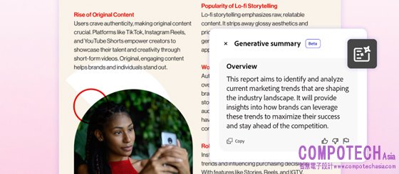 • AI支援創作、編輯和排版:過去一年,用戶在Acrobat編輯了數十億份文件。AI Assistant將可輕鬆快速地產出初稿,幫助文字編輯——即時調整語氣和調性,壓縮文字長度,並建議內容設計和排版。