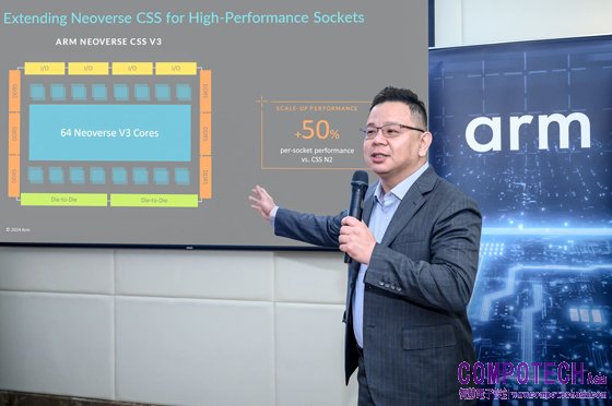 圖說四、Arm 首席應用工程師 徐煥昇指出新推出的Neoverse CSS V3 相較 CSS N2 ,每插槽效能提升超過50%