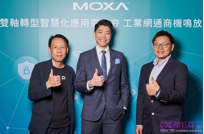 新聞照片一:Moxa持續看俏數位轉型及能源轉型商機,以完備的產品組合,攜同合作夥伴為雙軸轉型挹注豐沛能量(圖左起:加雲聯網副總經理何夢麟,持EDR-G9010系列安全路由器、Moxa台灣區總經理林世偉,持BXP系列嵌入式工業電腦、奕馬資訊總經理李秉恒,持DRP 系列DIN導軌式工業電腦)