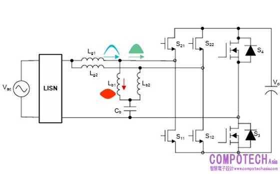 此拓撲結構使用兩個相位,相位差 180°,並具有一個單一DC 阻隔電容器 Cb,利用兩相位架構提供的漣波電流消除,並降低 Cb 中的均方根 (RMS) 電流應力。Lb1 和 Lb2的尺寸適合處理 TCM 運作所需的高頻 AC 漣波電流,消除TCM 所用電感器需要的 DC 偏壓負擔,如 [5] 中所定義。在存在零電壓切換 (ZVS) 所需的高通量擺幅時,使用Lb1 和 Lb2 的鐵氧體磁芯有助於確保低損耗。Lg1 和 Lg2 的值大於Lb1 和 Lb2(約大 10 倍),這可防止大部分高頻率電流流入輸入來源,進而改善 EMI。此外,Lg1 和 Lg2 中的漣波電流減少,即可使用低成本的核心材料。图 1同時說明電感器和開關節點的漣波電流包絡。