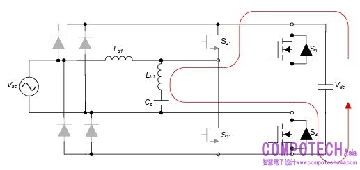 图 2. 同步整流器 S21 延遲關閉 Vdc 放電路徑。