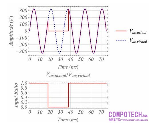 為了精準確定 AC 輸入是否存在,解決方案使用虛擬 AC 輸入訊號監測實際 AC 輸入的完整性。此虛擬訊號透過測量輸入電壓振幅、頻率和相位而產生,以便在正常運作過程中近乎完美地追蹤實際交流輸入的 50 和 60Hz 元件。透過比較實際輸入和虛擬輸入,系統可以輕鬆辨別是否存在 AC 輸入電壓。兩個訊號之間的差異如有任何突發變化,都表示發生輸入暫態事件。此暫態事件可用於偵測 AC 輸入電壓損失及復原狀況。图 3 說明虛擬 AC 輸入以及壓降事件期間的實際輸入。