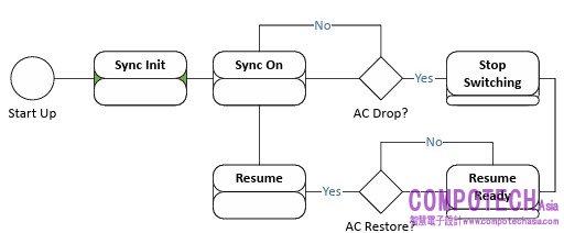 图 4 說明管理壓降和復原程序的狀態機。啟動時,系統會經過初始化週期 (同步初始化),RMS 輸入電壓幅度於此期間確定。其會使用軟體鎖相迴路 (SPLL) 來確保 Vac,virtual 的相位與 Vac,actual 相符。一旦 SPLL 鎖定 (同步開啟),處理器將監控 Vac,actual /Vac,virtual 之間的比率 (請參閱 图 3)。如果此比率小於目標閾值,則系統會宣告中斷事件,切換會立即停止 (停止狀態)。此時,系統將清除發生的所有故障並進入待機狀態 (就緒),在此狀態下,系統將監控Vac,actual/Vac,actual 比率,以確定比率何時高於恢復閾值。一旦狀態機確定 AC 復原,其將立即恢復切換並重新同步 SPLL (恢復狀態)。將 Vac,actual/Vac,actual 比率搭配 SPLL 使用,演算法可以確定任何輸入電壓或頻率的 AC 壓降和復原時間。此外,由於演算法始終監控 Vac,actual/Vac,actual 比率,其能夠比傳統的位準型解決方案更快回應,後者會偵測 AC 輸入電壓何時歸零。壓降的位準型架構監控可能會產生延遲,造成大電流突波及顯著逆電流。