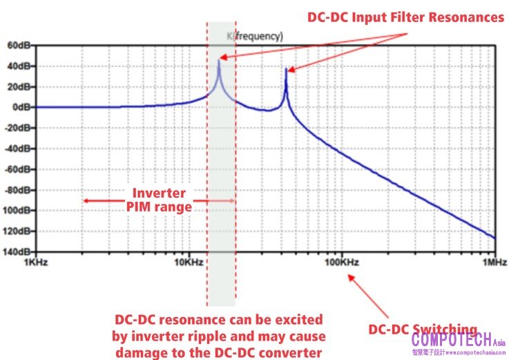 图 2:DC-DC 轉換器輸入濾波器設計用於衰減高頻率雜訊,而且可能具有與電機驅動器頻率範圍重疊的諧振。