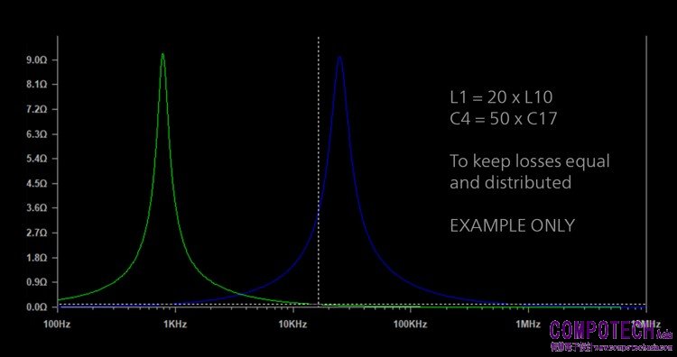 圖 3:濾波器輸出阻抗對濾波器內部損耗產生直接影響。在本示例中,綠色波形表示輸出阻抗更高(即損耗更高)的濾波器,高達 16kHz。