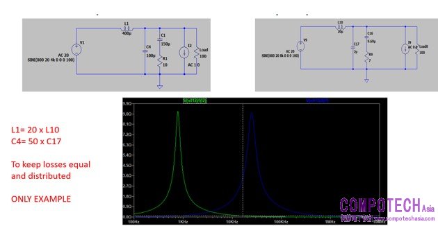 這裡的問題是截止頻率很低的濾波器需要大型濾波器元件(即電感器和電容器)。這些大型元件會佔用系統空間並增加系統重量,這在尋求優化功率密度的電動汽車設計中是不可取的。讓這個問題更複雜的是,在給定頻率範圍內具有更大輸出阻抗(即更大濾波器衰減)的濾波器會導致更大的功耗和濾波器的發熱(圖 3)。因此,使用截止頻率較低的濾波器則需要為濾波器元件提供較大的散熱器,這將進一步增加系統尺寸和重量。雖然濾波器可設計成最大限度降低輸出阻抗和損耗,但這也需要更大的濾波器元件(圖 4),進而需要對系統重量和尺寸進行權衡。