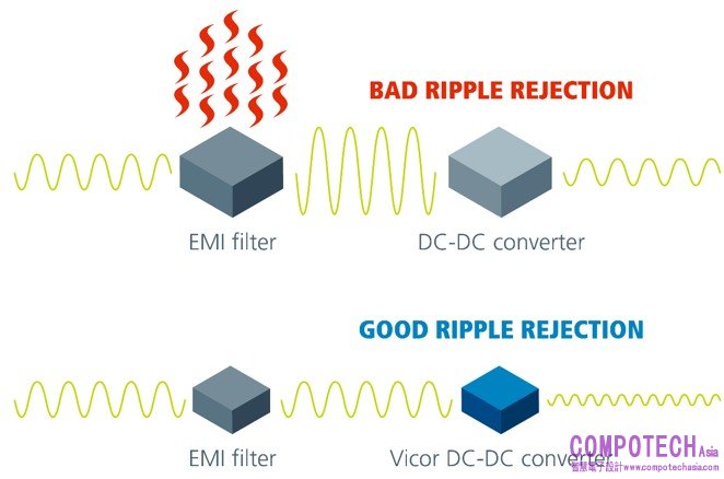 一種更有效的解決方案是將高開關頻率與軟開關拓撲相結合的 DC-DC 轉換器。任何數量的 Vicor 高密度電源模組均可實現紋波抑制。Vicor DCM™、BCM® 和 ZVS 穩壓器模組均採用高頻率,使轉換器具有更大的閉環頻寬。這些更大的頻寬可直接轉化為更顯著的紋波抑制,因為系統可以更好地處理更寬頻率範圍內的雜訊,包括與電機驅動器工作有關的頻率(圖 5)。