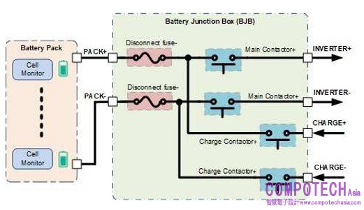 圖1. 蓄電池斷開保險絲和 BMS 配電中的高壓繼電器