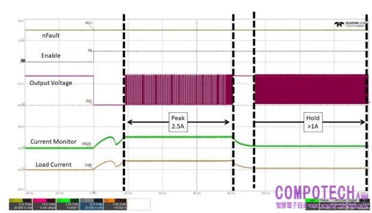 DRV3946-Q1 驅動器等完全整合的高功率接觸器驅動器 ,可取代複雜的節熱器設計。DRV3946-Q1 驅動器可有效 開啟和安全關閉接觸器。為了讓開啟更有效率, DRV3946-Q1 驅動器具有可編程的峰值和保持電流控制。圖 2 顯示此功能正在使用中。啓動時可提供更多電流以建立初始連接。連接完成後,電流可以在“保持”階段降低到 較低的水平。能夠對集成的峯值和保持相位進行編程,從而爲接觸器提供了更穩健,更高效的轉向。