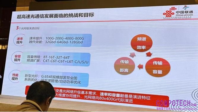 超高速光通信發展面臨著三個主要挑戰和目標:其一,是資料速率的提升,這依賴於器件的突破,器件的資料速率從32Gbd逐步提升至64Gbd,再到128Gbd,而速率也相應地從 100G 提升至 800G;其二,是容量的提升,要實現容量的倍增,從 8T 逐步遞增至 16T、32T 直至 64T;其三,是性能的提升,要將 G.654E 大規模部署至全國範圍。正是通過這三大維度的不斷推進,來實現超高速光通信的整體提升。