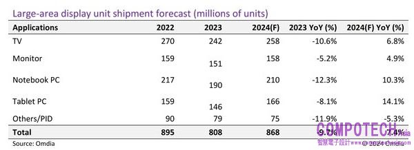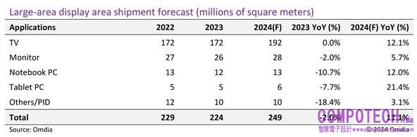 2024年4月25日--Omdia 最新發佈的 《2023 年第四季大尺寸面板市場追蹤 (Large Area Display Market Tracker 4Q23)》報告顯示,預計 2024 年包括 LCD 和 OLED 在內的大尺寸面板(所有 9 吋以上面板)的出貨量將年增 7.4%,出貨面積同比年增 11.1%。