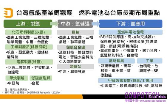 呼應國際趨勢,有別於過去主流灰氫的發展,目前群翌能源、台達電、台肥等台廠皆投入上游製氫端發展綠氫。群翌能源已從原本的燃料電池測試設備供應商,朝代理電解水製氫設備到自研發展;台達電善用其電子電力、控制和散熱技術,透過與英商Ceres合作燃料電池開發固態氧化物氫燃料電池(Solid Oxide Fuel Cell;SOFC)和固態氧化物水電解製氫(Solid Oxide Electrolysis Cell;SOEC);台肥從低碳氨裂解氫,期以氫能事業跨足乾淨能源產業。